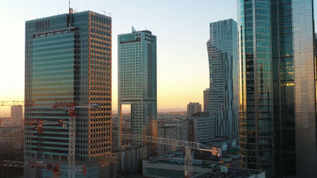 Beautiful panoramic aerial drone view on Warsaw City Skyscrapers, PKiN, and Varso Tower (the tallest skyscraper in the European Union) under construction during the January sunset. Warsaw, Poland.