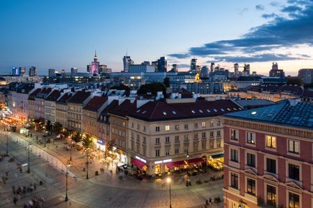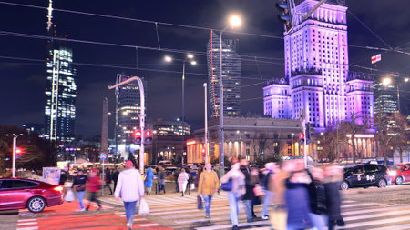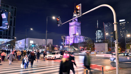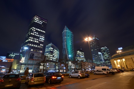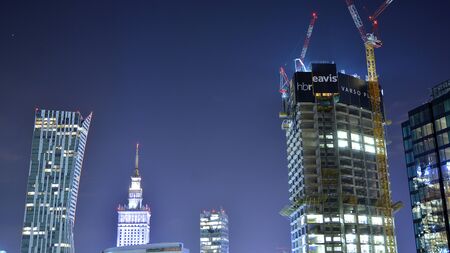 warsaw center at night and the palace of culture and science