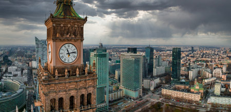 Aerial view of Palace of Culture and Science and downtown business skyscrapers in Warsaw