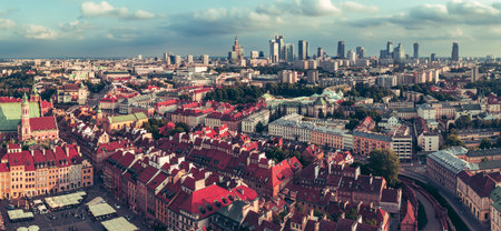 Historic city panorama with a high-angle view of the colorful rooftops of the buildings in the old town square. In the background, a view of the center of modern Warsaw with the silhouettes of skyscrapers.