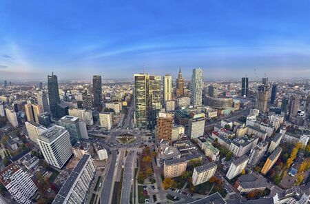 WARSAW, POLAND - NOVEMBER 20, 2018: Beautiful panoramic aerial skyline drone view to the skyscrapers located center of Warsaw City, Poland