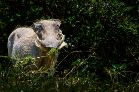 Portrait Warthog or Phacochoerus looking at camers with greenery on mouth in African bush in Tanzania in Arusha National Park