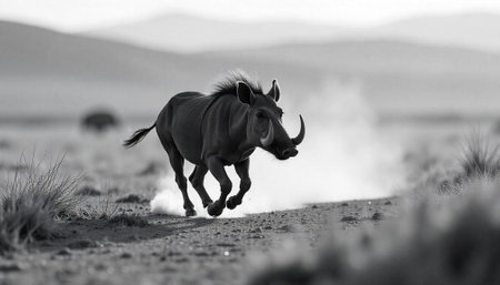 Warthog gallops through arid landscape, monochrome wildlife image