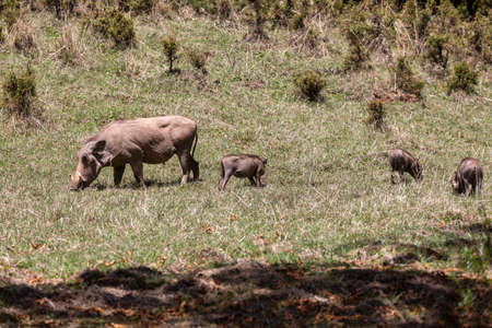 The warthog family on savannah in the Ngorongoro crater, Tanzania, Africa.
