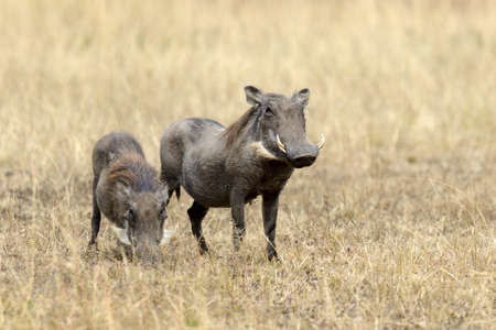 A pair of Warthogs walking in the Masai Mara National park, Kenya, Africa