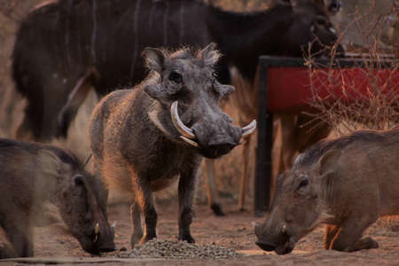Alert Warthogs Eating Feeding Pellets in Bushveld with Guardian