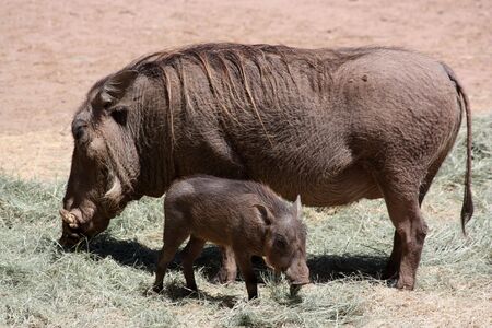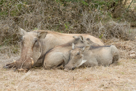 Female warthog suckling her young family in Addo Elephant national park, South Africa