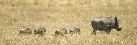 Blue wildebeest and common warthog grazing together
