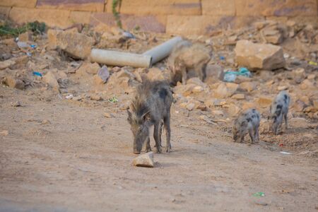 Jaisalmer, India - March 10 2017: Wild boars are looking for food near the city.