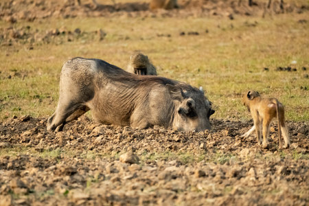 common warthogs, Phacochoerus africanus lying on ground