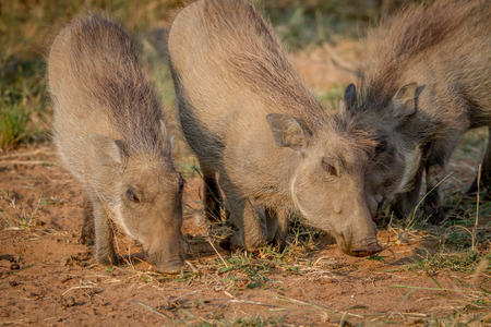 Group of Warthogs eating grass in the Pilanesberg National Park, South Africa.