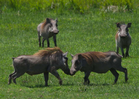 Landscape portrait of two wild warthogs (Phacochoerus africanus) fighting head-to-head in meadow Bale Mountains National Park, Ethiopia.