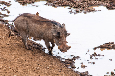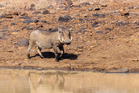 A warthog (Phacochoerus africanus) at a natural waterhole, South Africa