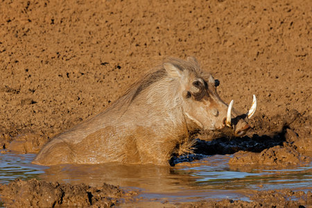 A warthog (Phacochoerus africanus) in a muddy waterhole, Mokala National Park, South Africa