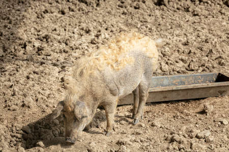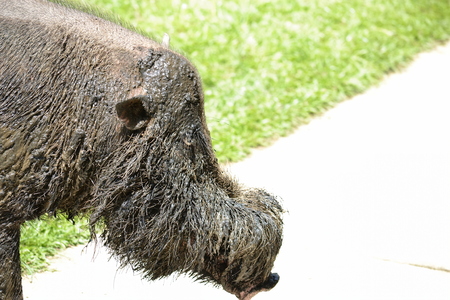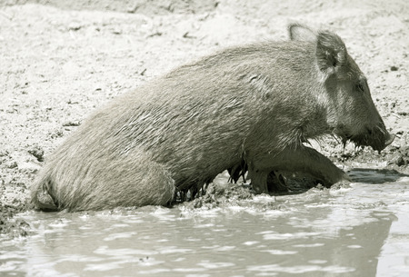 Wild boar with fangs in the mud.