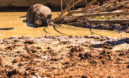 A Vietnamese pot bellied pig lying on muddy ground. Farm animal theme