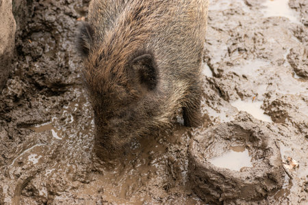 Saint Gallen, Switzerland, October 19, 2024 Wild boar in the mud in a wildlife park