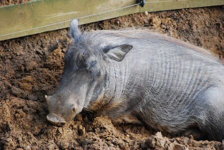 A warthog (Phacochoerus africanus) wallows in the mud at the Singapore Zoo.