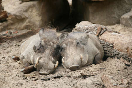 common warthogs, Phacochoerus africanus lying on ground