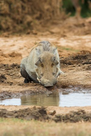 Ugly warthog drinking water at a pool