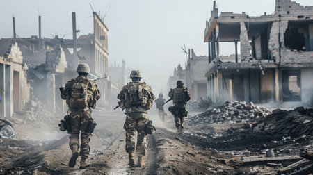 Uniformed soldier stands alert in a devastated city landscape, prepared for a mission amidst the ruins.