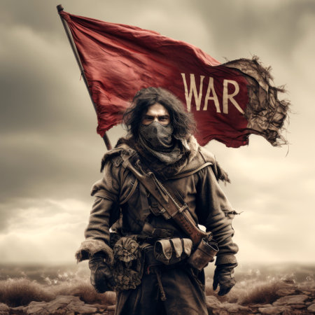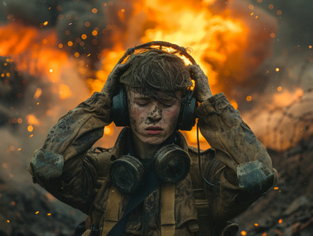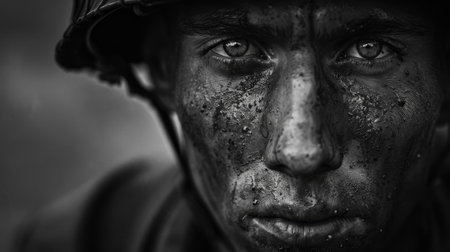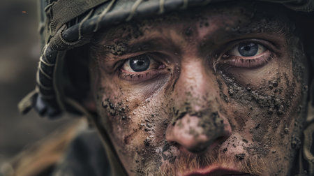Intense close up of battle weary soldier showcasing profound fatigue and extreme exhaustion