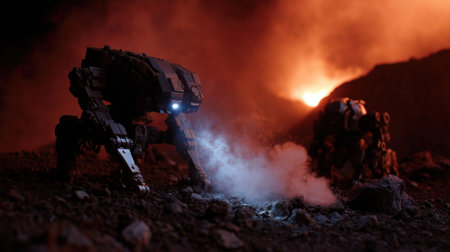 In the shadow of rugged cliffs robots scuttle their metallic limbs whirring with purpose. One collects ice shards from a crater while another processes them into hydrogen and oxygen
