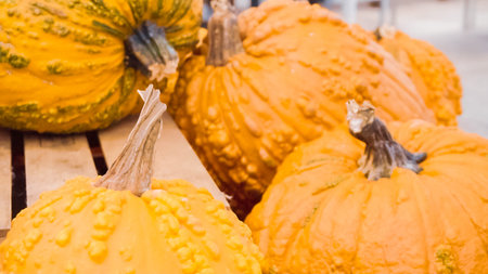 A close-up image of a group of ripe orange pumpkins with bumpy skin.