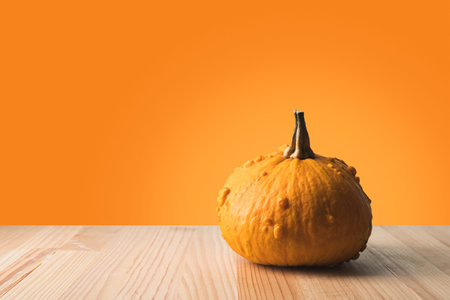 Halloween pumpkin on a wooden table with orange background. Large copy space on the left.