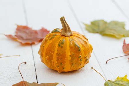 Decorative yellow pumpkin on a wooden white background made of planks, copy space