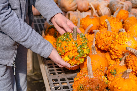 woman choosing pumpkin on a farmers market for Halloween carving. woman's hands hold ripe orange pumpkin.
