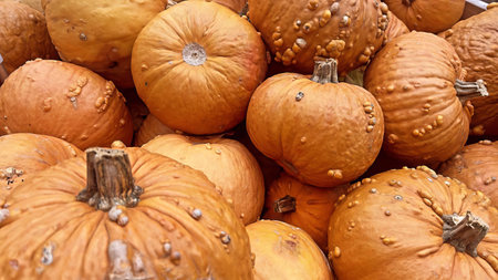 Autumn Pumpkin Thanksgiving Background - orange pumpkins over rusty background. Pile of warty Halloween pumpkins