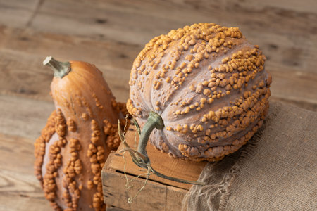 Galeux d Eysines Squash with Bumpy Skin Lies on an Old Wooden Barrel Against a Dark Background