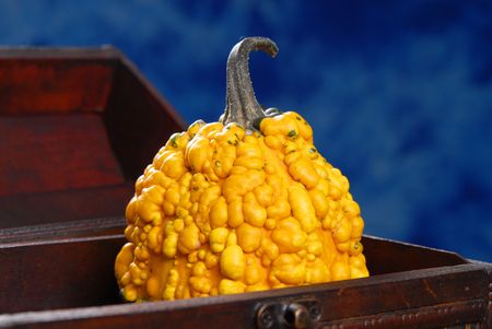 One fresh harvest farm yellow orange pumpkin with unusual funny curvy shape form on wooden shelf furniture box, with copy space for text
