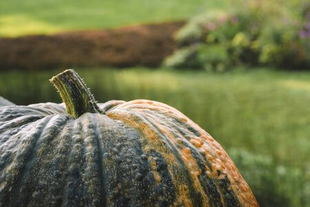 Single green pumpkin in a garden, close-up. Harvested squash close-up with the green garden in the background