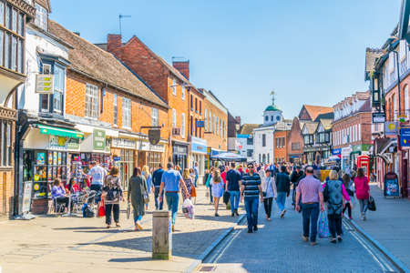 STRATFORD UPON AVON, UNITED KINGDOM, APRIL 8, 2017: People are strolling alongside traditional brick houses on Henley street in Stratford upon Avon, England