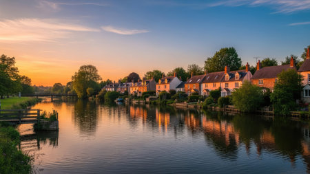 A calm river reflects the warm hues of a sunset, mirroring the buildings lining its banks. Trees frame the water's edge, adding depth to the scene. Soft light bathes the village in a peaceful atmosphere, creating a serene environment. The composition shows the beauty of nature.