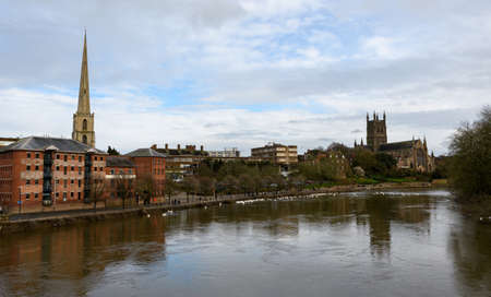 Worcester, United Kingdom - March 15 2020: The view of houses ware houses and churches along the River Severn from Worcester Bridge