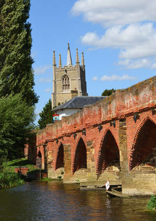 Great Barford Packhorse Bridge and All Saints Church Tower. Bedfordshire England.