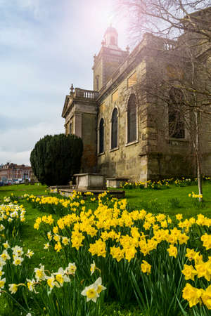 St Peter's and St Paul's church in Blandford Foum with a host of golden daffodils in the church yard