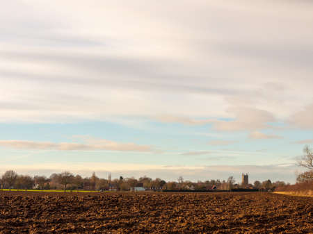brown ploughed agricultural field outside farm landscape sky ground dirt tree; essex; england; uk