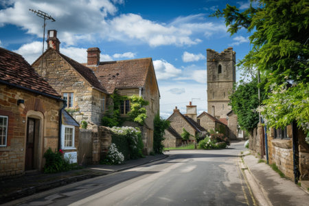 View of bright scenic landscape: cobblestone street english greenery village, summertime countryside scenery. Serene rural scene. Travel tourism trip concept. Gen ai illustration. Copy ad text space