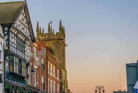 Church tower of parish church in Ellesmere Shropshire in England at sunset