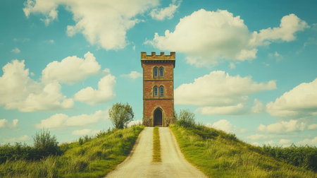 A photo of Derry Tower in Palmerstown, Northern Ireland. The tower stands on top of the hill and is visible from afar. It has three floors with small windows. In front, there's an old road leading to it. There's green vegetation around and white clouds in the blue sky. Taken with a Nikon D850 DSLR camera with an aperture of f/4, ISO 276, and a shutter speed of 1/32 second, resulting in a photorealistic image. --chaos 30 --ar 16:9 --v 6.1 Job ID: 078aabd5-b10c-4af2-8506-be48dae59442