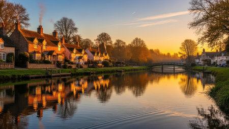 A calm river reflects the warm hues of a sunset, mirroring the buildings lining its banks. Trees frame the water's edge, adding depth to the scene. Soft light bathes the village in a peaceful atmosphere, creating a serene environment. The composition shows the beauty of nature.