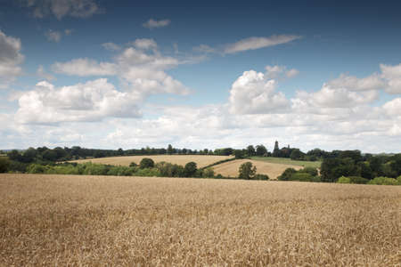 an english landscape with a view across fields of clover and wheat to a hilltop church under a blue sky