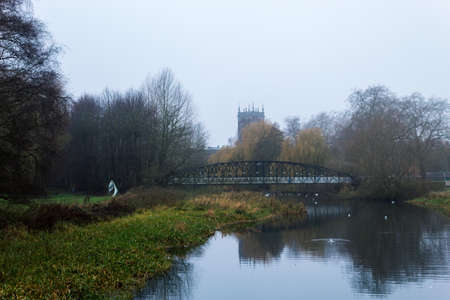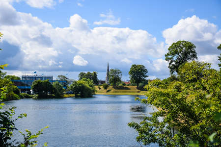Sunset view of town of Ellesmere in Shropshire with reflection view across the Mere to the Church