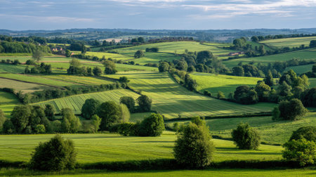 Scenic view of lush green rolling hills and fertile fields under a bright blue sky with fluffy clouds. A picturesque rural landscape capturing nature's beauty.