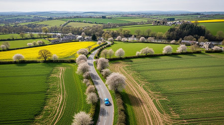 Journey showing scenic countryside road winding through lush green fields lined with blooming cherry blossom trees and a bright yellow rapeseed field keywords:...