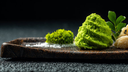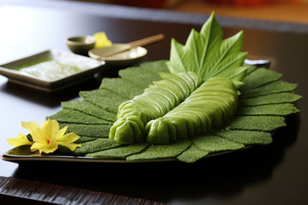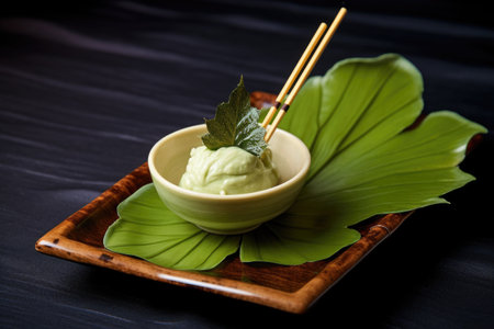 wasabi paste shaped in a leaf form placed on a sushi platter, created with generative ai